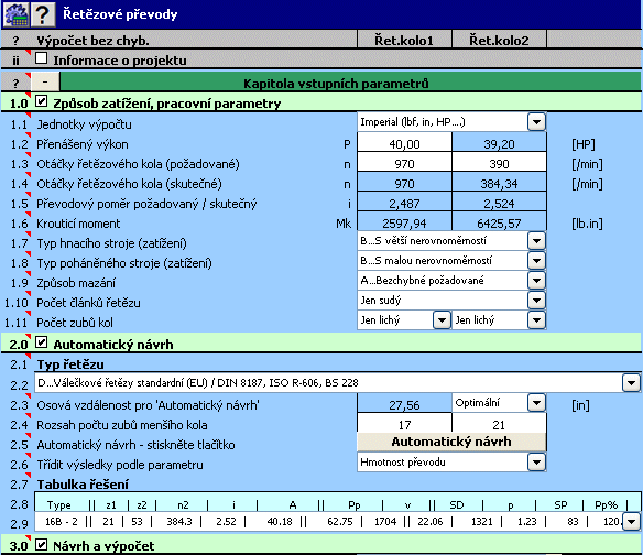 Řetězové převody. Výpočet je určen pro geometrický návrh a pevnostní kontrolu bežných řetězových převodů válečkovými řetězy.