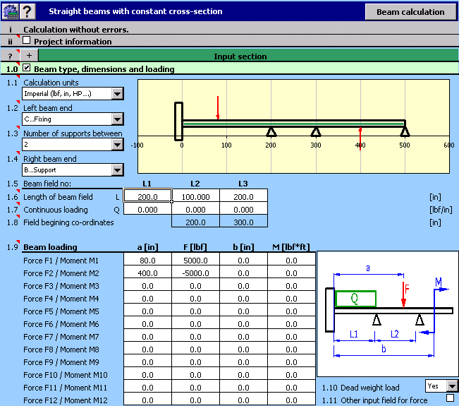 Calculations of straight, maximum three times static indefinite beams. Calculation of reactions in supports, moment, stress, deflection and bending angle.